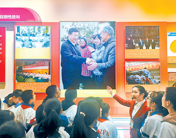 在习近平总书记与老党员崔荣海握手的照片前,小观众们认真听讲解员讲解。庄志阳 摄