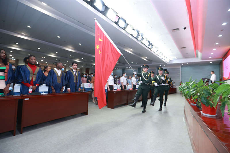 毕业是大学的最后一课,更是人生新的起点。今年是中国共产党成立100周年,为引导毕业生做有责任有担当的新青年,典礼现场举行了升旗仪式。伴随着《歌唱祖国》的音乐声响起,国旗护卫队怀着饱满的热情,迈着铿锵有力的步伐将国旗护送入场。雄壮的国歌声响起,全体师生满怀崇敬注视国旗冉冉升起,这是2021届毕业生最后一次升旗仪式。