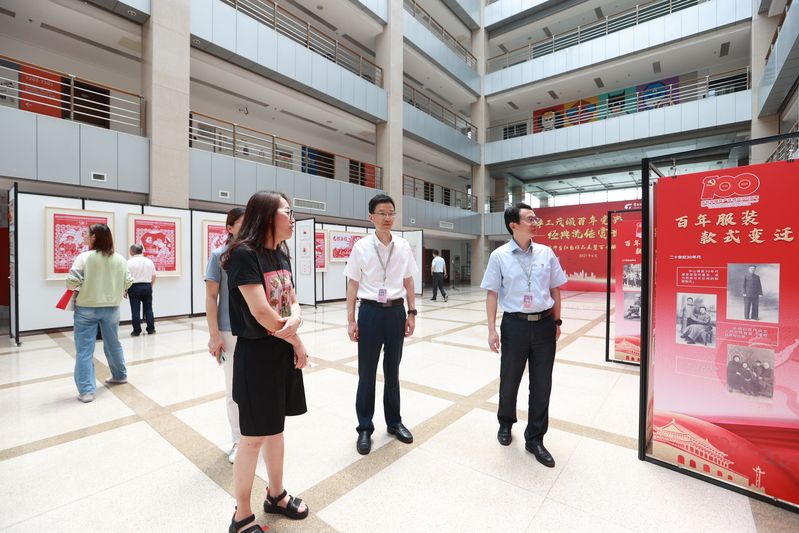 开幕式结束后,现场领导、嘉宾和师生参观了“风华正茂颂百年党史,经典流传赏世纪华裳”师生红色作品展暨百年服饰文化变迁展。