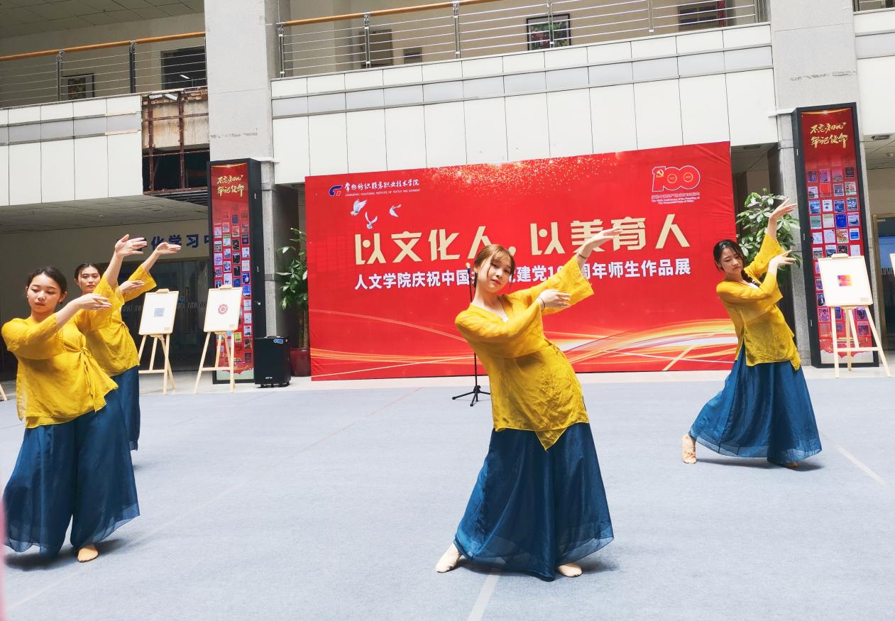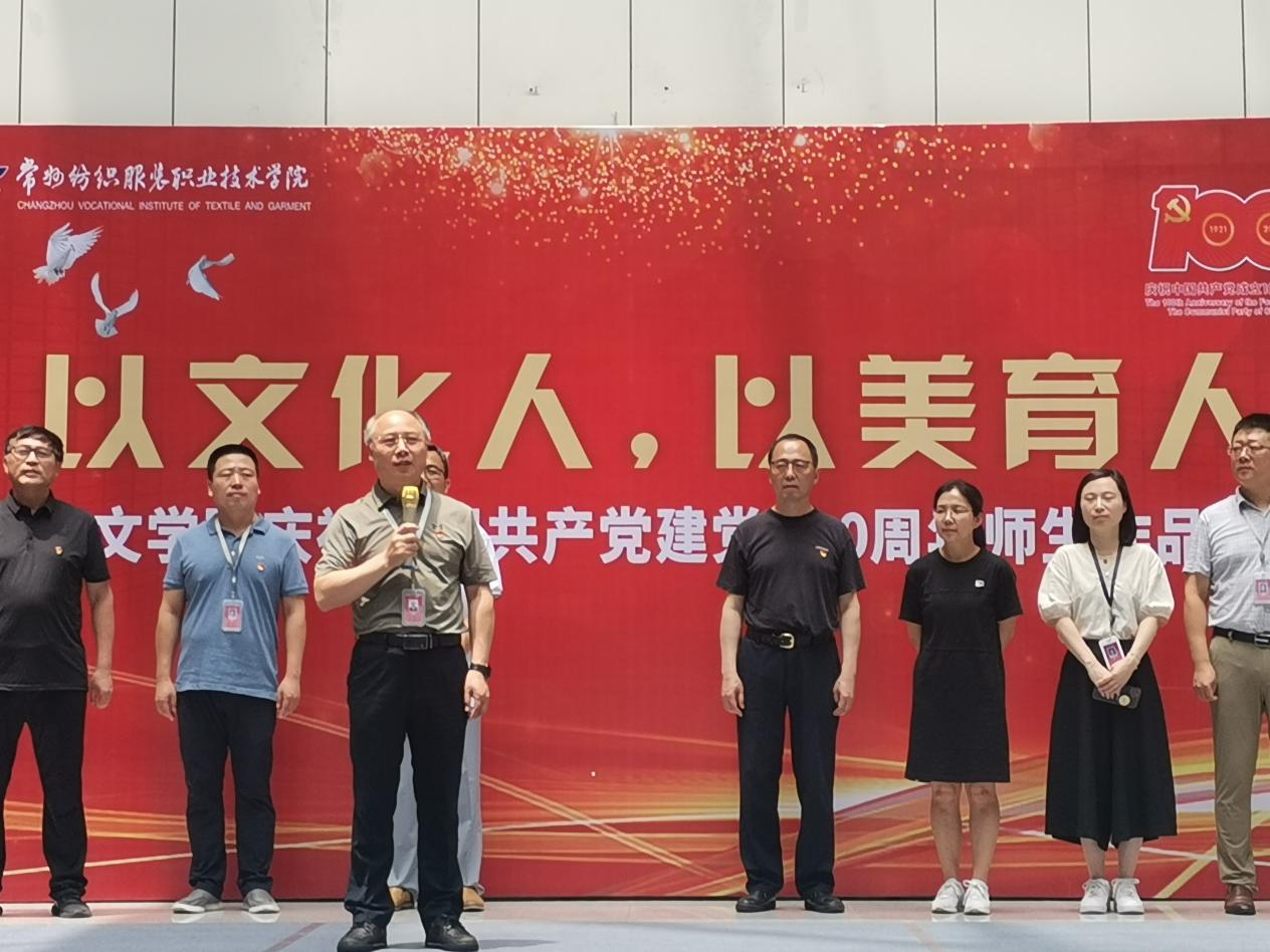 吴访升书记在开幕式上发表讲话。他指出,最近学校举行一系列庆祝中国共产党成立100周年活动,形式多样、异彩纷呈,很有意义。今天人文学院又在此举办师生作品展,借此机会我讲三句话。第一句话,要坚持立德树人、全面发展。刚才,开幕仪式前,我们首先领略了人文学院的舞蹈和音乐之美,说明常纺人文学院是最能体现“德智体美劳”全面发展教育思想的,常纺最大的优势在美育,人文学院也是一个创造美的教学单位,在座的既有老服专业、又有幼健专业的学生,我认为你们专业既是一种高尚的职业,也是一种时尚职业,是“德智体美劳”的最好体现。第二句话,要彰显传统优秀文化。要从传统国学中,尤其是中国书画中吸取营养,并与现代设计相结合,把我国的优秀传统文化弘扬好、传承好、并有所创新;第三句话,要根植于人民,服务于人民,艺术源于生活而又高于生活,美好生活要靠自己创造,艺术创作、人才培养要坚持“人民至上、以人民为中心“”的理念,要通过艺术创作进行价值引领,使得人们的思想变得更加高尚,预祝展览取得圆满成功。