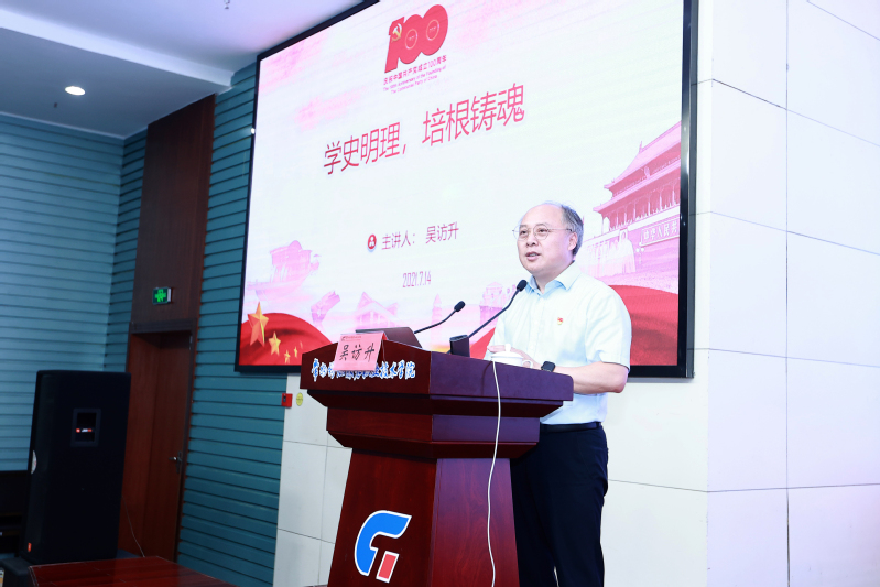 7月14日下午,为进一步学习宣传贯彻习近平总书记“七一”讲话精神,我校党委书记吴访升为机关党总支全体党员作了题为《学史明理,培根铸魂》的专题党课。省委教育工委党史学习教育派出第四指导组成员盐城工学院马克思主义学院教授陈根、苏州大学马克思主义学院党委组织员蒋慧现场指导。机关党总支书记韩兰娟主持专题党课。