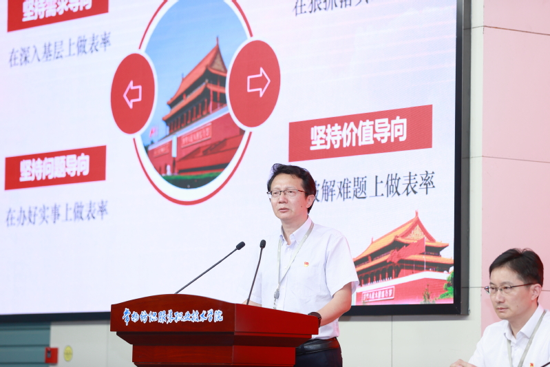党委副书记、院长洪霄在会上解读《在全校党员干部中开展“两在两同”建新功行动的实施方案》,从制定此次方案的背景、意义和依据,主要内容四个方面展开。方案要求,各级党组织要组织广大党员积极投身“两在两同”建新功行动,以锤炼党性、为民服务、推动发展的实际行动带动全校师生奋发进取、求真务实、担当奉献,充分发挥领导干部的示范带头作用和基层党员的先锋模范作用,切实肩负起“争当表率、争做示范、走在前列”的使命要求。