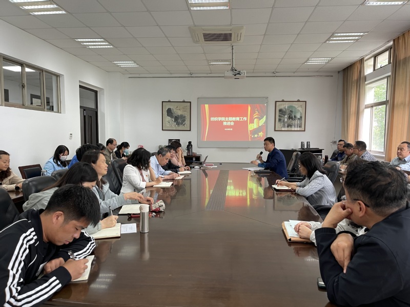 为了深入开展学习贯彻习近平新时代中国特色社会主义思想主题教育,纺织学院于5月24日下午召开主题教育工作推进会,学院全体教师参加。会上,党总支副书记史京军讲解主题教育工作安排。此次会议传达了学校主题教育相关会议精神,传达了学校领导在主题教育读书班的交流研讨成果,会议要求全体党员紧跟核心强忠诚、理论武装强本领、廉洁奉公强宗旨、推动发展强担当,把理论学习、调查研究、推动发展、检查整改四个方面贯通融合,扎实推进主题教育。会议最后,全体教师集体观看了主题教育专题学习片《嘱托·奋进》。