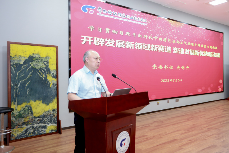 根据学校主题教育工作部署,2023年7月5日,校党委书记吴访升来到校学术报告厅向主题教育班子成员、全体中层干部、党支部书记、民主党派负责人讲授《开辟发展新领域新赛道,塑造发展新优势新动能》专题党课,省委主题教育第二十二巡回指导组组员焦惠刚到会指导。
