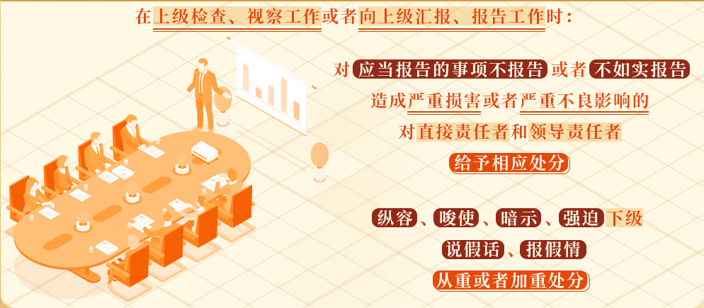 《中国共产党纪律处分条例》第一百四十条规定,在上级检查、视察工作或者向上级汇报、报告工作时,对应当报告的事项不报告或者不如实报告,造成严重损害或者严重不良影响的,对直接责任者和领导责任者,给予警告或者严重警告处分;情节严重的,给予撤销党内职务或者留党察看处分。在上级检查、视察工作或者向上级汇报、报告工作时纵容、唆使、暗示、强迫下级说假话、报假情的,从重或者加重处分。